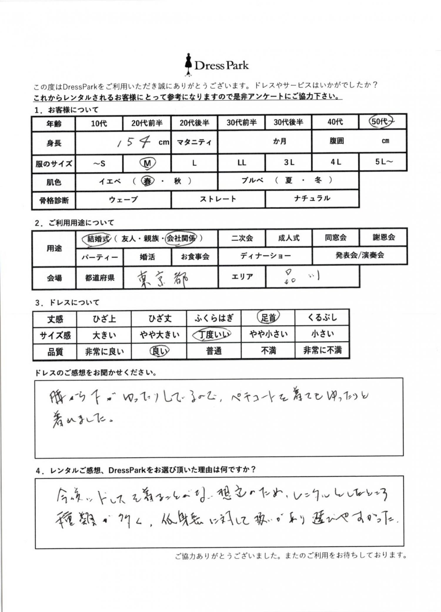 腰から下がゆったりしているので、ペチコートを着てもゆったり着られました。レンタルのご感想、