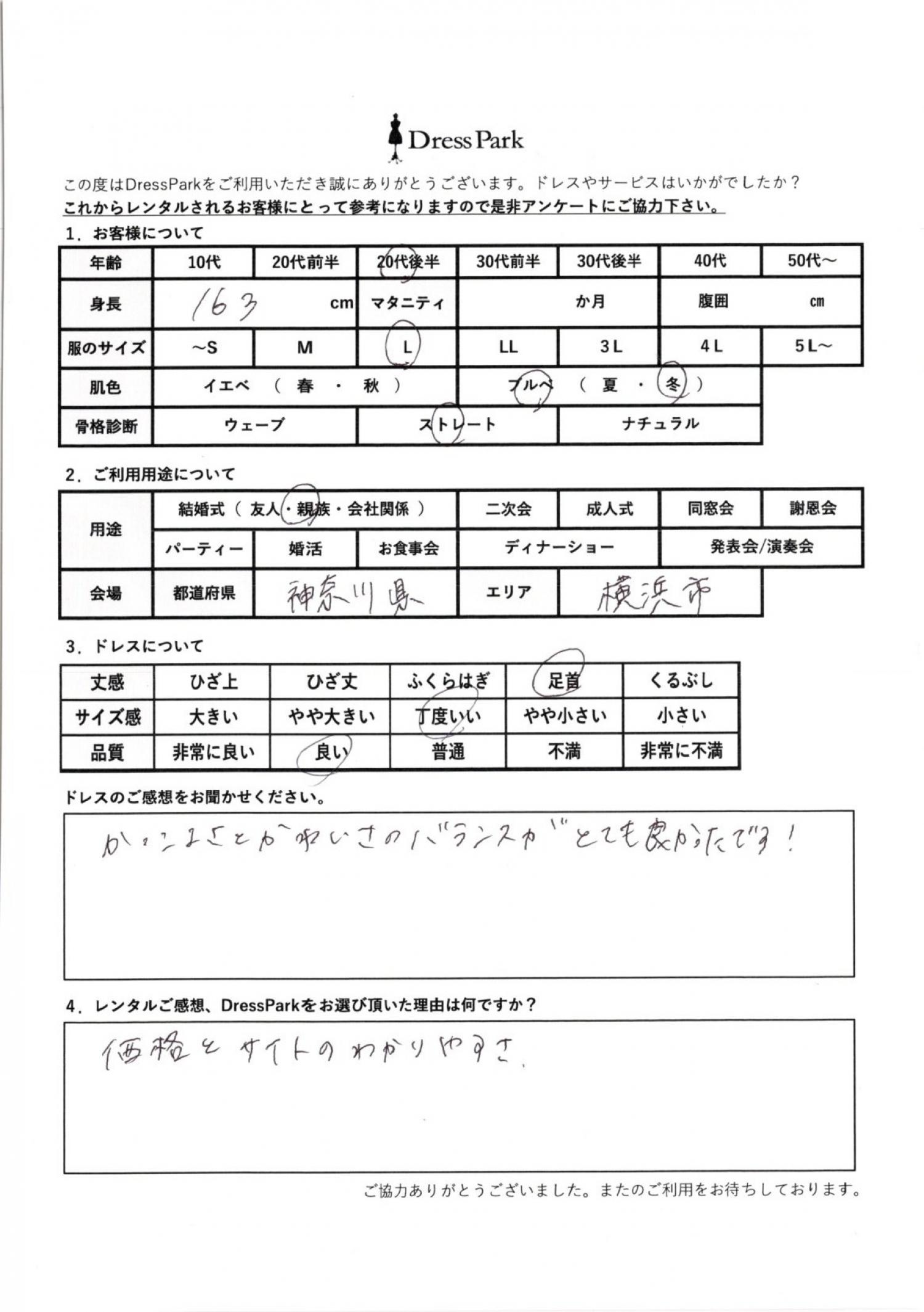 神奈川県 H.M様163㎝ Lサイズ横浜・みなとみらい #20代#M/L#160~164㎝#結婚式(親族)#神奈川県#横浜・みなとみらい ◆レンタルしたドレスはこちら ◆レンタルしたサイズは:L ◆レンタルした日付:2026/04/18 ドレスの着用感 ◆点数: (4点) ◆丈感:足首 ◆サイズ感:丁度いい ◆品質:良い ◆肌色:ブルべ ◆骨格診断:ストレート ドレスの感想 かっこよさとか、可愛さのバランスがとても良かったです! レンタルのご感想、DressParkをお選び頂いた理由 価格とサイトのわかりやすさ CUSTOMER REVIEWS お客様の声 気になるカテゴリー別にご利用の感想をチェック! ◆AGE 年代で見る 10代 20代 30代 40代 50代~ ◆SIZE サイズで見る SS/S M/L 大きいサイズLL~ ◆HIGHT 身長で見る 140~149㎝ 150~154㎝ 155~159㎝ 160~164㎝ 165~169㎝ 170㎝以上 ◆マタニティ ~3か月 4~6か月 7~8か月 9~10か月 ◆肌色 イエベ ブルべ ◆骨格診断 ウェーブ ストレート ナチュラル ◆利用シーン 結婚式(友人) 結婚式(親族) 結婚式(会社関係) 二次会 成人式/同窓会 謝恩会 パーティー その他 CUSTOMER REVIEWS都道府県別お客様の声 都道府県別にのお客様の声をチェック! 北海道 青森県 岩手県 宮城県 秋田県 山形県 福島県 茨城県 栃木県 群馬県 埼玉県 千葉県 東京都 神奈川県 新潟県 富山県 石川県 福井県 山梨県 長野県 岐阜県 静岡県 愛知県 三重県 滋賀県 京都府 大阪府 兵庫県 奈良県 和歌山県 鳥取県 島根県 岡山県 広島県 山口県 徳島県 香川県 愛媛県 高知県 福岡県 佐賀県 長崎県 熊本県 大分県 宮崎県 鹿児島県 沖縄県 CUSTOMER REVIEWSエリア別お客様の声 都道府県別にのお客様の声をチェック! 札幌 仙台 名古屋 軽井沢 金沢 神戸・芦屋 博多 那覇 梅田・新大阪 難波・心斎橋 鎌倉・湘南 横浜・みなとみらい 舞浜・浦安・幕張 大宮・浦和 青山・表参道 六本木・麻布 渋谷・恵比寿 新宿 池袋 銀座・丸の内 お台場・汐留 鹿児島市 郡山市 福島市 東予 甲府・石和 LINEでお問い合わせ このサイトではJavaScriptを使用しています