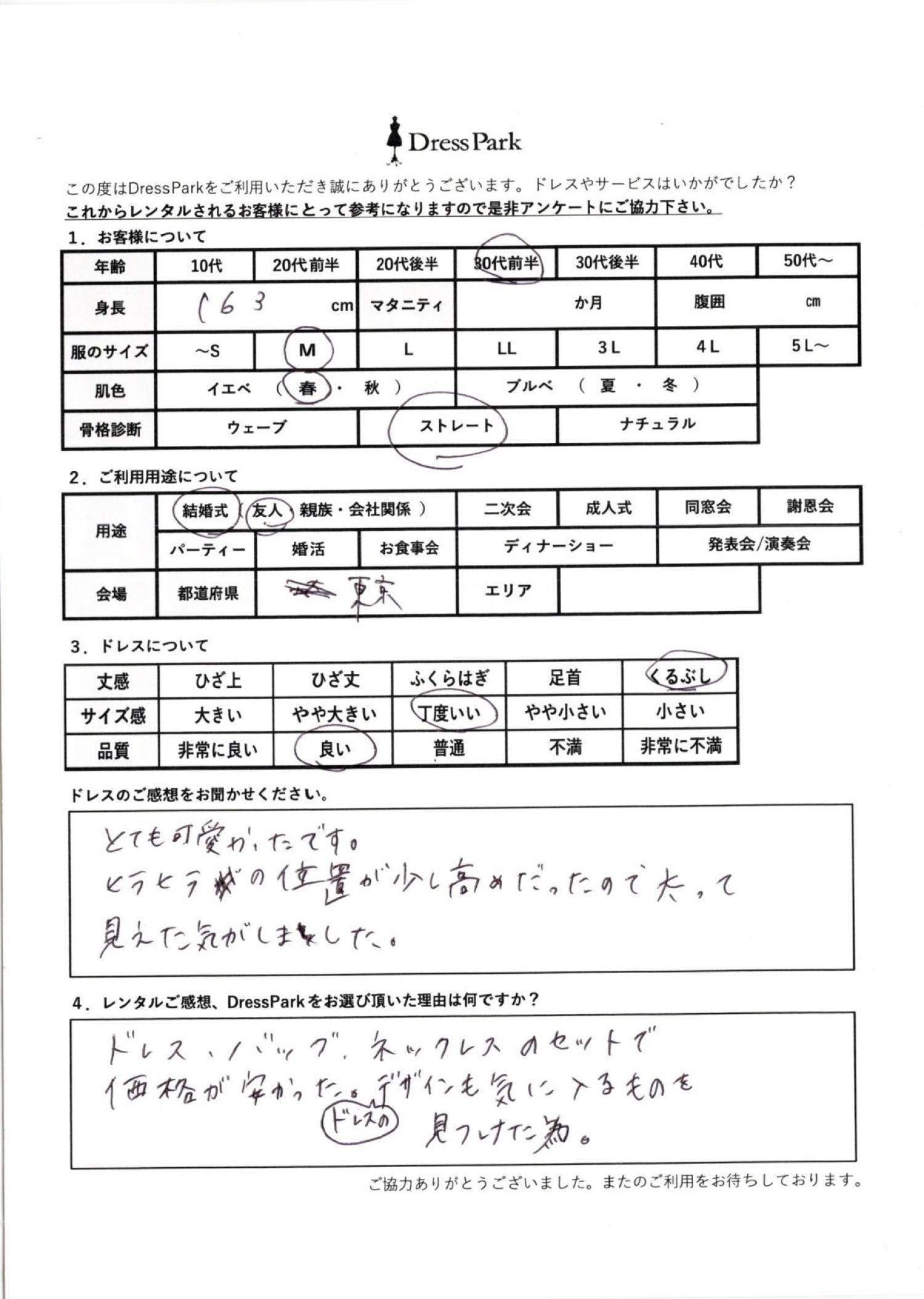 とても可愛かったです。ひらひらの位置が少し高めだったので、太って見えた気がしました。レンタルのご感想、