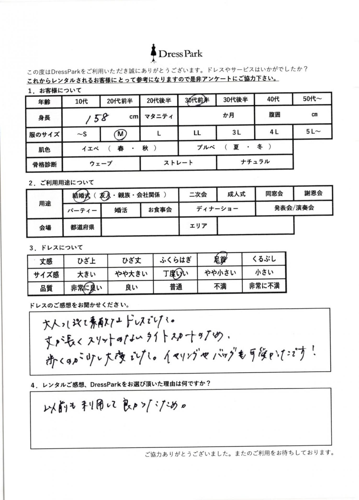 東京都 K.S様158㎝ Mサイズ #30代#M/L#155~159㎝#結婚式(友人)#東京都 ◆レンタルしたドレスはこちら ◆レンタルしたサイズは:S ◆レンタルした日付:2026/04/18 ドレスの着用感 ◆点数: (5点) ◆丈感:足首 ◆サイズ感:丁度いい ◆品質:非常に良い ドレスの感想 大人っぽくて素敵なドレスでした。丈が長くスリットのないタイトスカートのため、歩くのが少し大変でした。イヤリングやバッグも可愛かったです! レンタルのご感想、DressParkをお選び頂いた理由 以前も利用して良かったため。 CUSTOMER REVIEWS お客様の声 気になるカテゴリー別にご利用の感想をチェック! ◆AGE 年代で見る 10代 20代 30代 40代 50代~ ◆SIZE サイズで見る SS/S M/L 大きいサイズLL~ ◆HIGHT 身長で見る 140~149㎝ 150~154㎝ 155~159㎝ 160~164㎝ 165~169㎝ 170㎝以上 ◆マタニティ ~3か月 4~6か月 7~8か月 9~10か月 ◆肌色 イエベ ブルべ ◆骨格診断 ウェーブ ストレート ナチュラル ◆利用シーン 結婚式(友人) 結婚式(親族) 結婚式(会社関係) 二次会 成人式/同窓会 謝恩会 パーティー その他 CUSTOMER REVIEWS都道府県別お客様の声 都道府県別にのお客様の声をチェック! 北海道 青森県 岩手県 宮城県 秋田県 山形県 福島県 茨城県 栃木県 群馬県 埼玉県 千葉県 東京都 神奈川県 新潟県 富山県 石川県 福井県 山梨県 長野県 岐阜県 静岡県 愛知県 三重県 滋賀県 京都府 大阪府 兵庫県 奈良県 和歌山県 鳥取県 島根県 岡山県 広島県 山口県 徳島県 香川県 愛媛県 高知県 福岡県 佐賀県 長崎県 熊本県 大分県 宮崎県 鹿児島県 沖縄県 CUSTOMER REVIEWSエリア別お客様の声 都道府県別にのお客様の声をチェック! 札幌 仙台 名古屋 軽井沢 金沢 神戸・芦屋 博多 那覇 梅田・新大阪 難波・心斎橋 鎌倉・湘南 横浜・みなとみらい 舞浜・浦安・幕張 大宮・浦和 青山・表参道 六本木・麻布 渋谷・恵比寿 新宿 池袋 銀座・丸の内 お台場・汐留 鹿児島市 郡山市 福島市 東予 甲府・石和 LINEでお問い合わせ このサイトではJavaScriptを使用しています