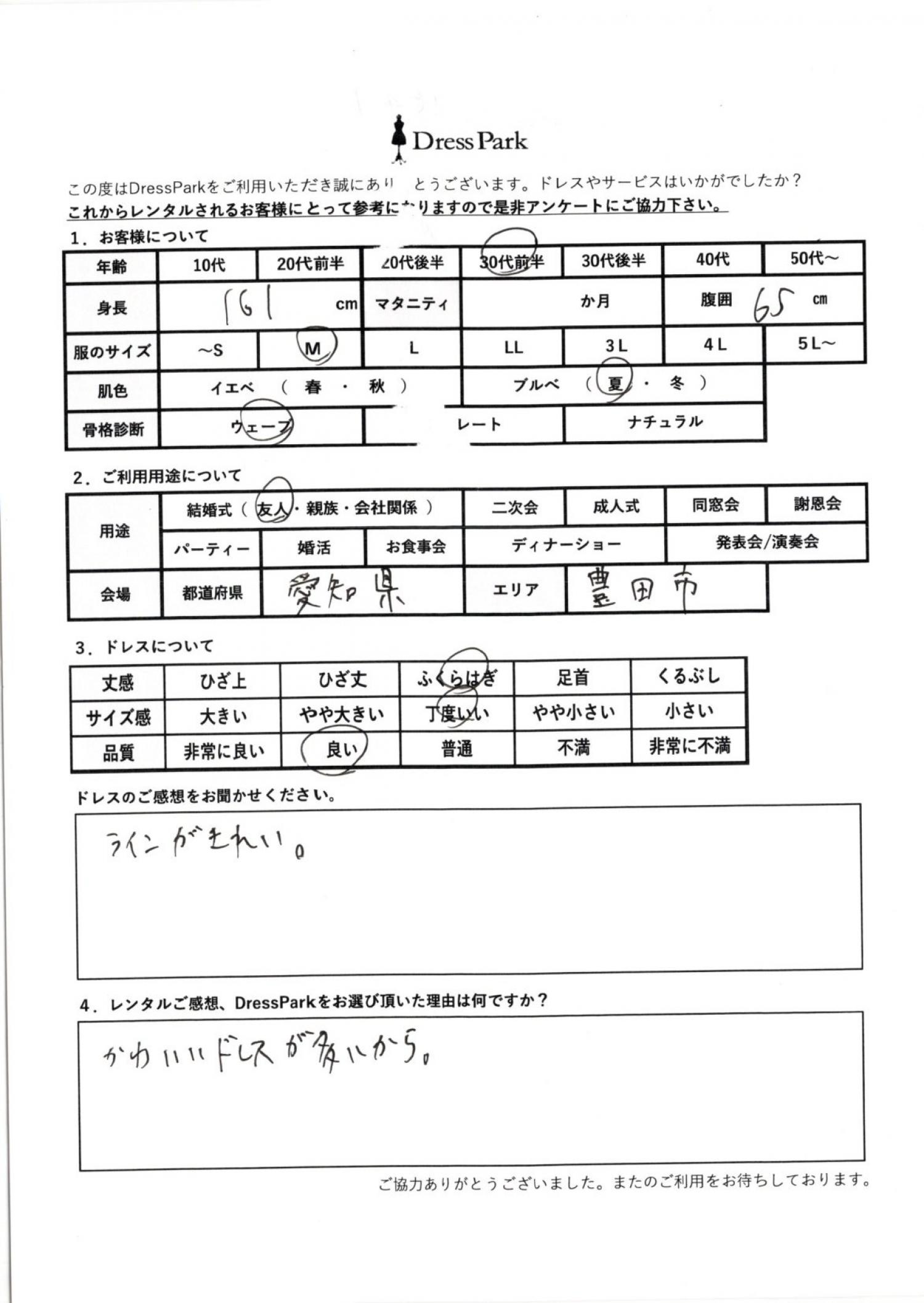 愛知県 S.I様161㎝ Mサイズ #30代#M/L#160~164㎝#結婚式(友人)#愛知県 ◆レンタルしたドレスはこちら ◆レンタルしたサイズは:M ◆レンタルした日付:2026/04/18 ドレスの着用感 ◆点数: (4点) ◆丈感:ふくらはぎ ◆サイズ感:丁度いい ◆品質:良い ◆肌色:ブルべ ◆骨格診断:ウェーブ ドレスの感想 ラインが綺麗。 レンタルのご感想、DressParkをお選び頂いた理由 かわいいドレスが多いから。 CUSTOMER REVIEWS お客様の声 気になるカテゴリー別にご利用の感想をチェック! ◆AGE 年代で見る 10代 20代 30代 40代 50代~ ◆SIZE サイズで見る SS/S M/L 大きいサイズLL~ ◆HIGHT 身長で見る 140~149㎝ 150~154㎝ 155~159㎝ 160~164㎝ 165~169㎝ 170㎝以上 ◆マタニティ ~3か月 4~6か月 7~8か月 9~10か月 ◆肌色 イエベ ブルべ ◆骨格診断 ウェーブ ストレート ナチュラル ◆利用シーン 結婚式(友人) 結婚式(親族) 結婚式(会社関係) 二次会 成人式/同窓会 謝恩会 パーティー その他 CUSTOMER REVIEWS都道府県別お客様の声 都道府県別にのお客様の声をチェック! 北海道 青森県 岩手県 宮城県 秋田県 山形県 福島県 茨城県 栃木県 群馬県 埼玉県 千葉県 東京都 神奈川県 新潟県 富山県 石川県 福井県 山梨県 長野県 岐阜県 静岡県 愛知県 三重県 滋賀県 京都府 大阪府 兵庫県 奈良県 和歌山県 鳥取県 島根県 岡山県 広島県 山口県 徳島県 香川県 愛媛県 高知県 福岡県 佐賀県 長崎県 熊本県 大分県 宮崎県 鹿児島県 沖縄県 CUSTOMER REVIEWSエリア別お客様の声 都道府県別にのお客様の声をチェック! 札幌 仙台 名古屋 軽井沢 金沢 神戸・芦屋 博多 那覇 梅田・新大阪 難波・心斎橋 鎌倉・湘南 横浜・みなとみらい 舞浜・浦安・幕張 大宮・浦和 青山・表参道 六本木・麻布 渋谷・恵比寿 新宿 池袋 銀座・丸の内 お台場・汐留 鹿児島市 郡山市 福島市 東予 甲府・石和 LINEでお問い合わせ このサイトではJavaScriptを使用しています