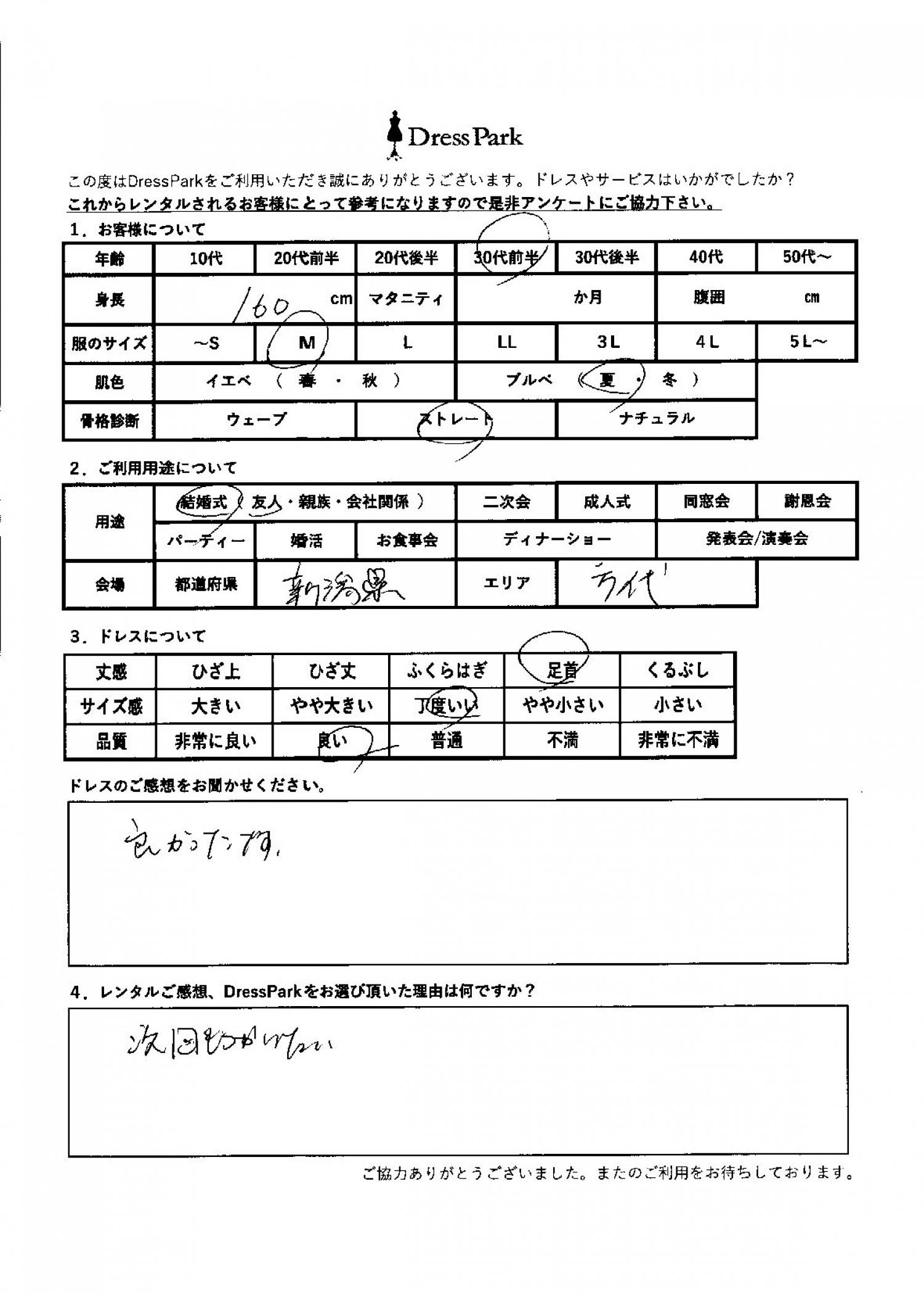 新潟県 E.M様160㎝ Mサイズ #30代#M/L#160~164㎝#結婚式(友人)#新潟県 ◆レンタルしたドレスはこちら ◆レンタルしたサイズは:M ◆レンタルした日付:2026/04/18 ドレスの着用感 ◆点数: (4点) ◆丈感:足首 ◆サイズ感:丁度いい ◆品質:良い ◆肌色:ブルべ ◆骨格診断:ストレート ドレスの感想 よかったです。 レンタルのご感想、DressParkをお選び頂いた理由 次回も使いたい。 CUSTOMER REVIEWS お客様の声 気になるカテゴリー別にご利用の感想をチェック! ◆AGE 年代で見る 10代 20代 30代 40代 50代~ ◆SIZE サイズで見る SS/S M/L 大きいサイズLL~ ◆HIGHT 身長で見る 140~149㎝ 150~154㎝ 155~159㎝ 160~164㎝ 165~169㎝ 170㎝以上 ◆マタニティ ~3か月 4~6か月 7~8か月 9~10か月 ◆肌色 イエベ ブルべ ◆骨格診断 ウェーブ ストレート ナチュラル ◆利用シーン 結婚式(友人) 結婚式(親族) 結婚式(会社関係) 二次会 成人式/同窓会 謝恩会 パーティー その他 CUSTOMER REVIEWS都道府県別お客様の声 都道府県別にのお客様の声をチェック! 北海道 青森県 岩手県 宮城県 秋田県 山形県 福島県 茨城県 栃木県 群馬県 埼玉県 千葉県 東京都 神奈川県 新潟県 富山県 石川県 福井県 山梨県 長野県 岐阜県 静岡県 愛知県 三重県 滋賀県 京都府 大阪府 兵庫県 奈良県 和歌山県 鳥取県 島根県 岡山県 広島県 山口県 徳島県 香川県 愛媛県 高知県 福岡県 佐賀県 長崎県 熊本県 大分県 宮崎県 鹿児島県 沖縄県 CUSTOMER REVIEWSエリア別お客様の声 都道府県別にのお客様の声をチェック! 札幌 仙台 名古屋 軽井沢 金沢 神戸・芦屋 博多 那覇 梅田・新大阪 難波・心斎橋 鎌倉・湘南 横浜・みなとみらい 舞浜・浦安・幕張 大宮・浦和 青山・表参道 六本木・麻布 渋谷・恵比寿 新宿 池袋 銀座・丸の内 お台場・汐留 鹿児島市 郡山市 福島市 東予 甲府・石和 LINEでお問い合わせ このサイトではJavaScriptを使用しています