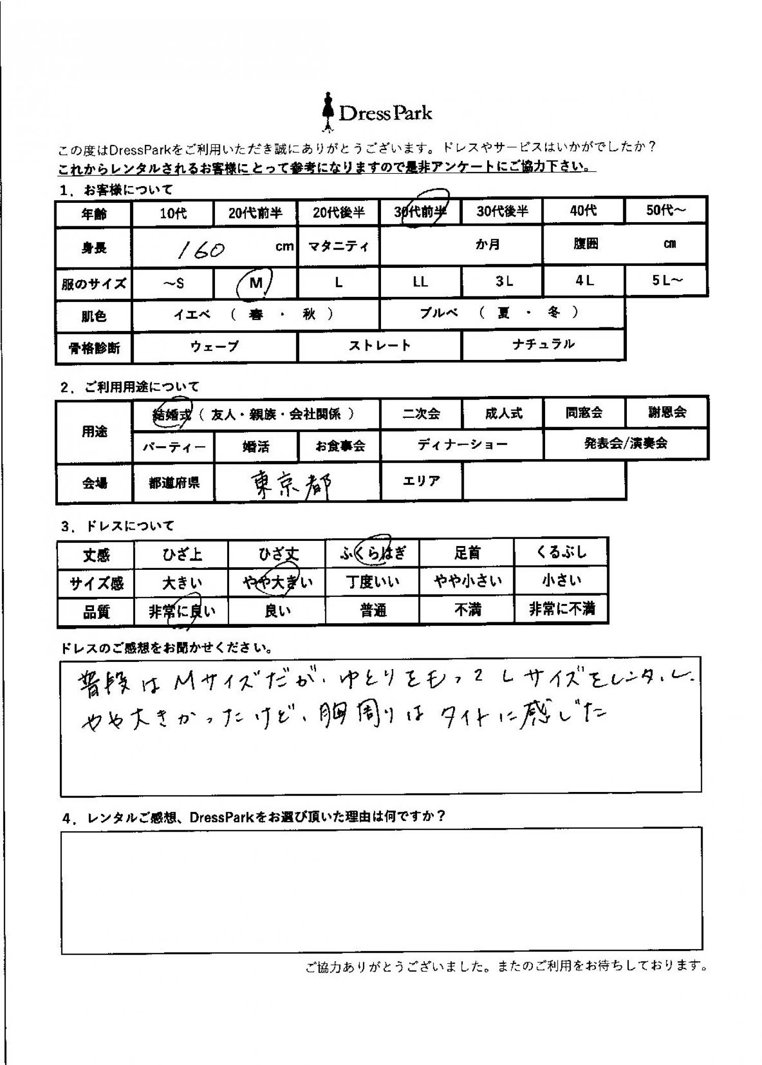 東京都 A.M様160㎝ Mサイズ #30代#M/L#160~164㎝#結婚式(友人)#東京都 ◆レンタルしたドレスはこちら ◆レンタルしたサイズは:L ◆レンタルした日付:2026/04/19 ドレスの着用感 ◆点数: (5点) ◆丈感:ふくらはぎ ◆サイズ感:やや大きい ◆品質:非常に良い ドレスの感想 普段はMサイズだが、ゆとりを持ってLサイズをレンタル。やや大きかったけど、胸回りはタイトに感じた。 CUSTOMER REVIEWS お客様の声 気になるカテゴリー別にご利用の感想をチェック! ◆AGE 年代で見る 10代 20代 30代 40代 50代~ ◆SIZE サイズで見る SS/S M/L 大きいサイズLL~ ◆HIGHT 身長で見る 140~149㎝ 150~154㎝ 155~159㎝ 160~164㎝ 165~169㎝ 170㎝以上 ◆マタニティ ~3か月 4~6か月 7~8か月 9~10か月 ◆肌色 イエベ ブルべ ◆骨格診断 ウェーブ ストレート ナチュラル ◆利用シーン 結婚式(友人) 結婚式(親族) 結婚式(会社関係) 二次会 成人式/同窓会 謝恩会 パーティー その他 CUSTOMER REVIEWS都道府県別お客様の声 都道府県別にのお客様の声をチェック! 北海道 青森県 岩手県 宮城県 秋田県 山形県 福島県 茨城県 栃木県 群馬県 埼玉県 千葉県 東京都 神奈川県 新潟県 富山県 石川県 福井県 山梨県 長野県 岐阜県 静岡県 愛知県 三重県 滋賀県 京都府 大阪府 兵庫県 奈良県 和歌山県 鳥取県 島根県 岡山県 広島県 山口県 徳島県 香川県 愛媛県 高知県 福岡県 佐賀県 長崎県 熊本県 大分県 宮崎県 鹿児島県 沖縄県 CUSTOMER REVIEWSエリア別お客様の声 都道府県別にのお客様の声をチェック! 札幌 仙台 名古屋 軽井沢 金沢 神戸・芦屋 博多 那覇 梅田・新大阪 難波・心斎橋 鎌倉・湘南 横浜・みなとみらい 舞浜・浦安・幕張 大宮・浦和 青山・表参道 六本木・麻布 渋谷・恵比寿 新宿 池袋 銀座・丸の内 お台場・汐留 鹿児島市 郡山市 福島市 東予 甲府・石和 LINEでお問い合わせ このサイトではJavaScriptを使用しています