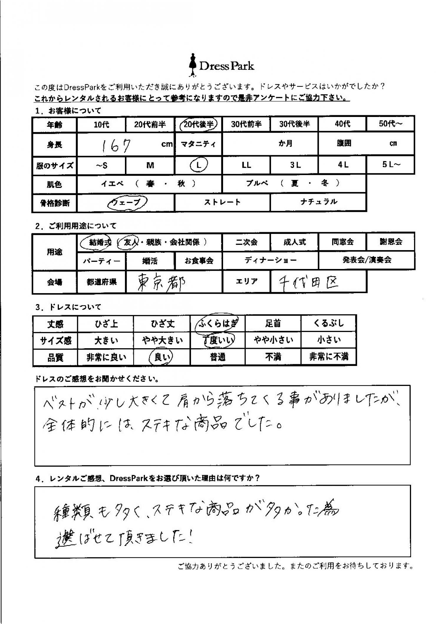 東京都 Y.O様167㎝ Lサイズ銀座・丸の内 #20代#M/L#165~169㎝#結婚式(友人)#東京都#銀座・丸の内 ◆レンタルしたドレスはこちら ◆レンタルしたサイズは:L ◆レンタルした日付:2026/04/19 ドレスの着用感 ◆点数: (4点) ◆丈感:ふくらはぎ ◆サイズ感:丁度いい ◆品質:良い ◆骨格診断:ウェーブ ドレスの感想 ベストが少し大きくて肩から落ちてくることがありましたが、全体的には素敵な商品でした。 レンタルのご感想、DressParkをお選び頂いた理由 種類も多く、素敵な商品が多かったため、選ばさせていただきました! CUSTOMER REVIEWS お客様の声 気になるカテゴリー別にご利用の感想をチェック! ◆AGE 年代で見る 10代 20代 30代 40代 50代~ ◆SIZE サイズで見る SS/S M/L 大きいサイズLL~ ◆HIGHT 身長で見る 140~149㎝ 150~154㎝ 155~159㎝ 160~164㎝ 165~169㎝ 170㎝以上 ◆マタニティ ~3か月 4~6か月 7~8か月 9~10か月 ◆肌色 イエベ ブルべ ◆骨格診断 ウェーブ ストレート ナチュラル ◆利用シーン 結婚式(友人) 結婚式(親族) 結婚式(会社関係) 二次会 成人式/同窓会 謝恩会 パーティー その他 CUSTOMER REVIEWS都道府県別お客様の声 都道府県別にのお客様の声をチェック! 北海道 青森県 岩手県 宮城県 秋田県 山形県 福島県 茨城県 栃木県 群馬県 埼玉県 千葉県 東京都 神奈川県 新潟県 富山県 石川県 福井県 山梨県 長野県 岐阜県 静岡県 愛知県 三重県 滋賀県 京都府 大阪府 兵庫県 奈良県 和歌山県 鳥取県 島根県 岡山県 広島県 山口県 徳島県 香川県 愛媛県 高知県 福岡県 佐賀県 長崎県 熊本県 大分県 宮崎県 鹿児島県 沖縄県 CUSTOMER REVIEWSエリア別お客様の声 都道府県別にのお客様の声をチェック! 札幌 仙台 名古屋 軽井沢 金沢 神戸・芦屋 博多 那覇 梅田・新大阪 難波・心斎橋 鎌倉・湘南 横浜・みなとみらい 舞浜・浦安・幕張 大宮・浦和 青山・表参道 六本木・麻布 渋谷・恵比寿 新宿 池袋 銀座・丸の内 お台場・汐留 鹿児島市 郡山市 福島市 東予 甲府・石和 LINEでお問い合わせ このサイトではJavaScriptを使用しています