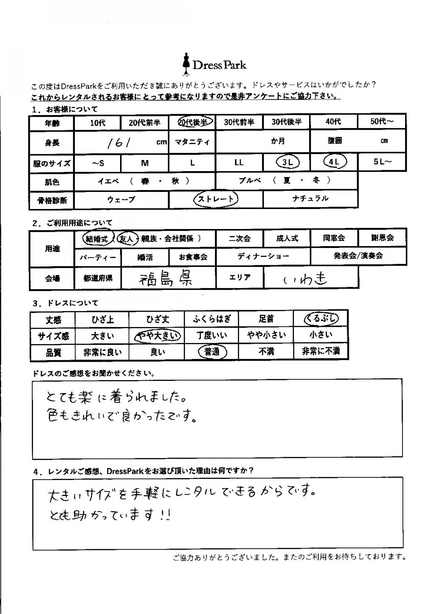 福島県 A.I様161㎝ 3Lサイズ #20代#大きいサイズLL~#160~164㎝#結婚式(友人)#福島県 ◆レンタルしたドレスはこちら ◆レンタルしたサイズは:3L ◆レンタルした日付:2026/04/19 ドレスの着用感 ◆点数: (4点) ◆丈感:くるぶし ◆サイズ感:やや大きい ◆品質:普通 ◆骨格診断:ストレート ドレスの感想 とても楽に着られました。色も綺麗でよかったです。 レンタルのご感想、DressParkをお選び頂いた理由 大きいサイズを手軽にレンタルできるからです。とっても助かっています! CUSTOMER REVIEWS お客様の声 気になるカテゴリー別にご利用の感想をチェック! ◆AGE 年代で見る 10代 20代 30代 40代 50代~ ◆SIZE サイズで見る SS/S M/L 大きいサイズLL~ ◆HIGHT 身長で見る 140~149㎝ 150~154㎝ 155~159㎝ 160~164㎝ 165~169㎝ 170㎝以上 ◆マタニティ ~3か月 4~6か月 7~8か月 9~10か月 ◆肌色 イエベ ブルべ ◆骨格診断 ウェーブ ストレート ナチュラル ◆利用シーン 結婚式(友人) 結婚式(親族) 結婚式(会社関係) 二次会 成人式/同窓会 謝恩会 パーティー その他 CUSTOMER REVIEWS都道府県別お客様の声 都道府県別にのお客様の声をチェック! 北海道 青森県 岩手県 宮城県 秋田県 山形県 福島県 茨城県 栃木県 群馬県 埼玉県 千葉県 東京都 神奈川県 新潟県 富山県 石川県 福井県 山梨県 長野県 岐阜県 静岡県 愛知県 三重県 滋賀県 京都府 大阪府 兵庫県 奈良県 和歌山県 鳥取県 島根県 岡山県 広島県 山口県 徳島県 香川県 愛媛県 高知県 福岡県 佐賀県 長崎県 熊本県 大分県 宮崎県 鹿児島県 沖縄県 CUSTOMER REVIEWSエリア別お客様の声 都道府県別にのお客様の声をチェック! 札幌 仙台 名古屋 軽井沢 金沢 神戸・芦屋 博多 那覇 梅田・新大阪 難波・心斎橋 鎌倉・湘南 横浜・みなとみらい 舞浜・浦安・幕張 大宮・浦和 青山・表参道 六本木・麻布 渋谷・恵比寿 新宿 池袋 銀座・丸の内 お台場・汐留 鹿児島市 郡山市 福島市 東予 甲府・石和 LINEでお問い合わせ このサイトではJavaScriptを使用しています