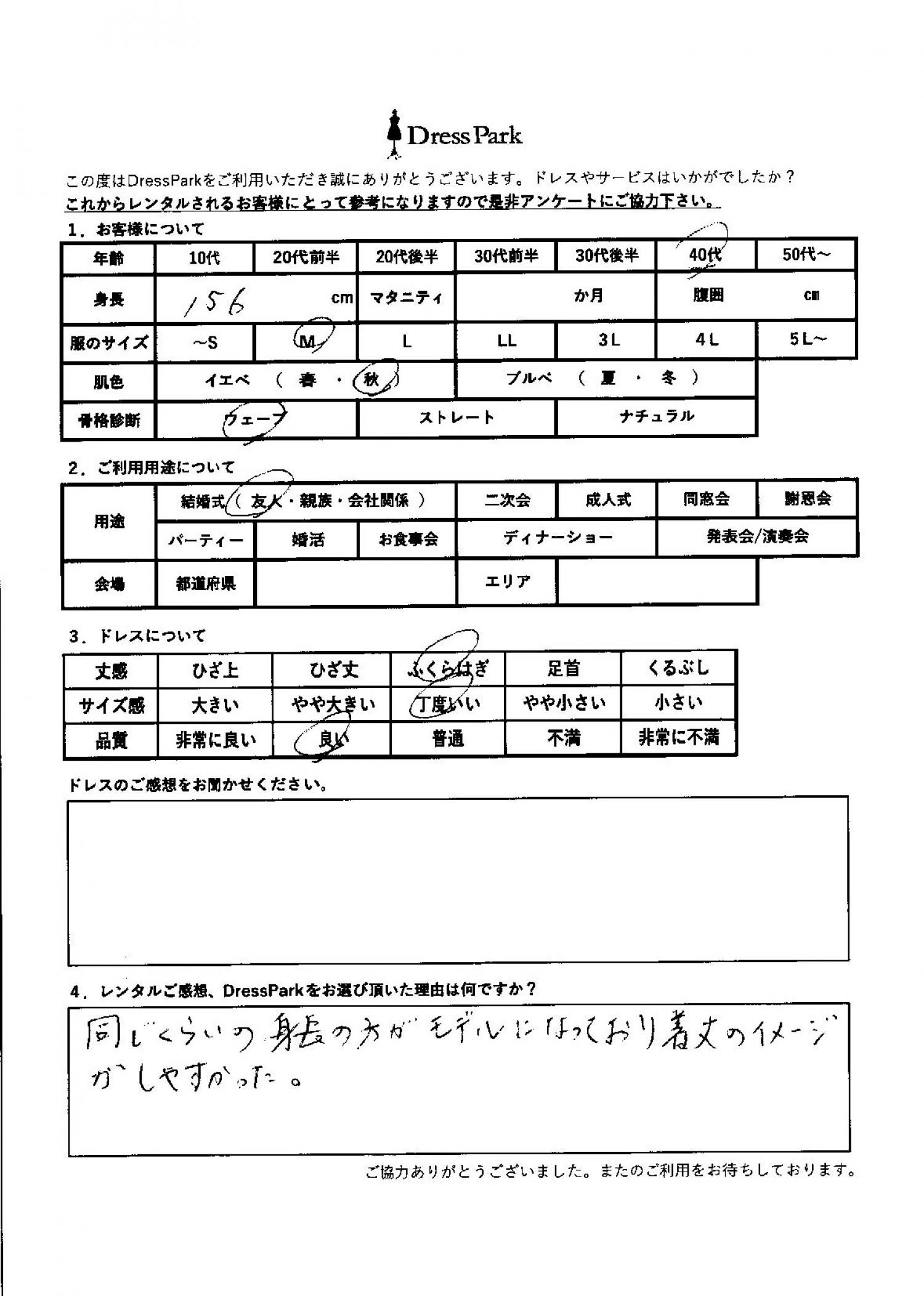 東京都 M.U様156㎝ Mサイズ #40代#M/L#155~159㎝#結婚式(友人)#東京都 ◆レンタルしたドレスはこちら ◆レンタルしたサイズは:M ◆レンタルした日付:2026/04/19 ドレスの着用感 ◆点数: (4点) ◆丈感:ふくらはぎ ◆サイズ感:丁度いい ◆品質:良い ◆肌色:イエベ ◆骨格診断:ウェーブ ドレスの感想 同じ位の身長の方がモデルになっており、着丈のイメージがしやすかった。 CUSTOMER REVIEWS お客様の声 気になるカテゴリー別にご利用の感想をチェック! ◆AGE 年代で見る 10代 20代 30代 40代 50代~ ◆SIZE サイズで見る SS/S M/L 大きいサイズLL~ ◆HIGHT 身長で見る 140~149㎝ 150~154㎝ 155~159㎝ 160~164㎝ 165~169㎝ 170㎝以上 ◆マタニティ ~3か月 4~6か月 7~8か月 9~10か月 ◆肌色 イエベ ブルべ ◆骨格診断 ウェーブ ストレート ナチュラル ◆利用シーン 結婚式(友人) 結婚式(親族) 結婚式(会社関係) 二次会 成人式/同窓会 謝恩会 パーティー その他 CUSTOMER REVIEWS都道府県別お客様の声 都道府県別にのお客様の声をチェック! 北海道 青森県 岩手県 宮城県 秋田県 山形県 福島県 茨城県 栃木県 群馬県 埼玉県 千葉県 東京都 神奈川県 新潟県 富山県 石川県 福井県 山梨県 長野県 岐阜県 静岡県 愛知県 三重県 滋賀県 京都府 大阪府 兵庫県 奈良県 和歌山県 鳥取県 島根県 岡山県 広島県 山口県 徳島県 香川県 愛媛県 高知県 福岡県 佐賀県 長崎県 熊本県 大分県 宮崎県 鹿児島県 沖縄県 CUSTOMER REVIEWSエリア別お客様の声 都道府県別にのお客様の声をチェック! 札幌 仙台 名古屋 軽井沢 金沢 神戸・芦屋 博多 那覇 梅田・新大阪 難波・心斎橋 鎌倉・湘南 横浜・みなとみらい 舞浜・浦安・幕張 大宮・浦和 青山・表参道 六本木・麻布 渋谷・恵比寿 新宿 池袋 銀座・丸の内 お台場・汐留 鹿児島市 郡山市 福島市 東予 甲府・石和 LINEでお問い合わせ このサイトではJavaScriptを使用しています