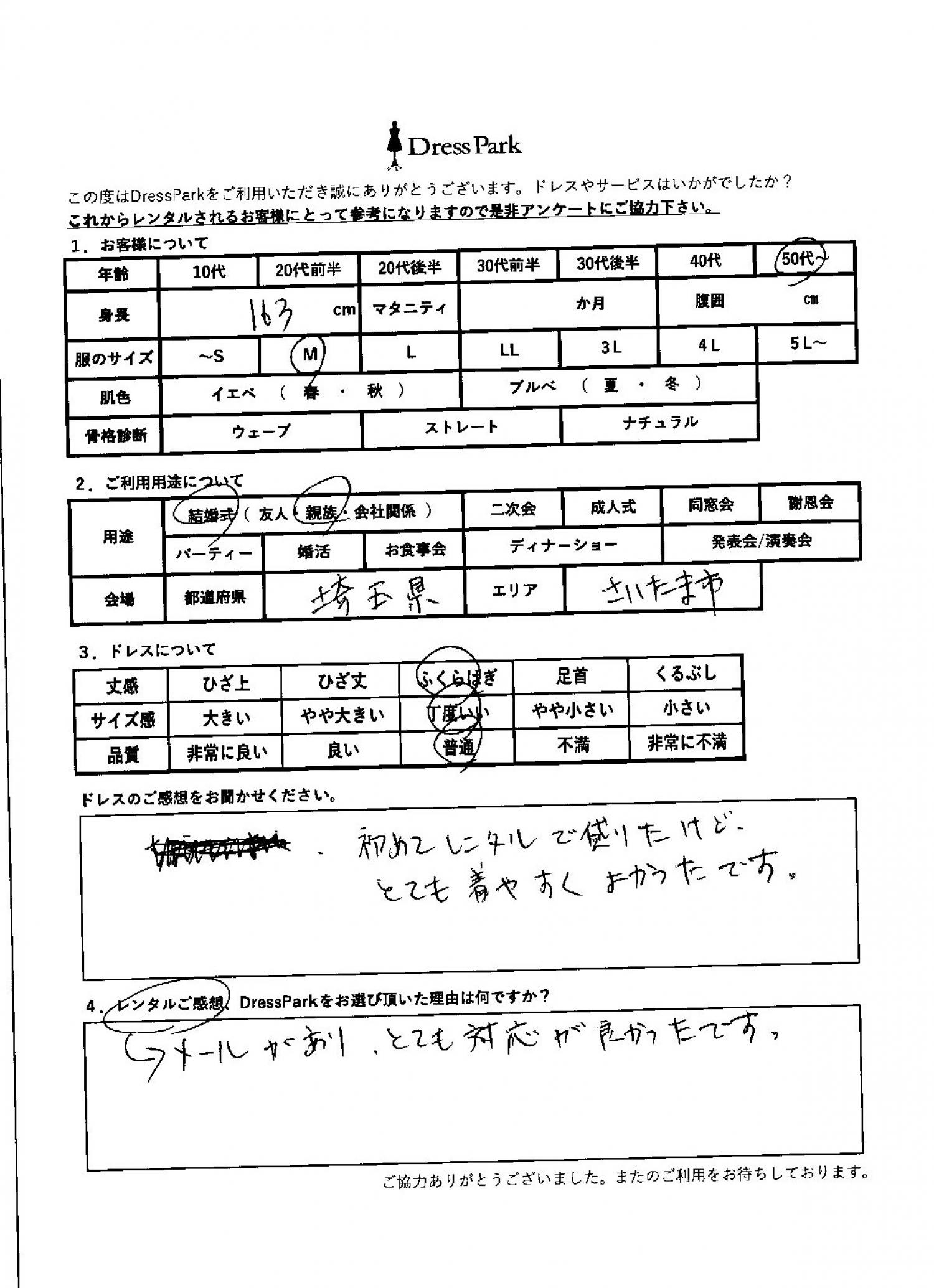 埼玉県 Y.T様163㎝ Mサイズ #50代~#M/L#160~164㎝#結婚式(親族)#埼玉県 ◆レンタルしたドレスはこちら ◆レンタルしたサイズは:M ◆レンタルした日付:2026/04/25 ドレスの着用感 ◆点数: (4点) ◆丈感:ふくらはぎ ◆サイズ感:丁度いい ◆品質:普通 ドレスの感想 初めてレンタルで借りたけど、とても着やすく良かったです。 レンタルのご感想、DressParkをお選び頂いた理由 メールがあり、とても対応が良かったです。 CUSTOMER REVIEWS お客様の声 気になるカテゴリー別にご利用の感想をチェック! ◆AGE 年代で見る 10代 20代 30代 40代 50代~ ◆SIZE サイズで見る SS/S M/L 大きいサイズLL~ ◆HIGHT 身長で見る 140~149㎝ 150~154㎝ 155~159㎝ 160~164㎝ 165~169㎝ 170㎝以上 ◆マタニティ ~3か月 4~6か月 7~8か月 9~10か月 ◆肌色 イエベ ブルべ ◆骨格診断 ウェーブ ストレート ナチュラル ◆利用シーン 結婚式(友人) 結婚式(親族) 結婚式(会社関係) 二次会 成人式/同窓会 謝恩会 パーティー その他 CUSTOMER REVIEWS都道府県別お客様の声 都道府県別にのお客様の声をチェック! 北海道 青森県 岩手県 宮城県 秋田県 山形県 福島県 茨城県 栃木県 群馬県 埼玉県 千葉県 東京都 神奈川県 新潟県 富山県 石川県 福井県 山梨県 長野県 岐阜県 静岡県 愛知県 三重県 滋賀県 京都府 大阪府 兵庫県 奈良県 和歌山県 鳥取県 島根県 岡山県 広島県 山口県 徳島県 香川県 愛媛県 高知県 福岡県 佐賀県 長崎県 熊本県 大分県 宮崎県 鹿児島県 沖縄県 CUSTOMER REVIEWSエリア別お客様の声 都道府県別にのお客様の声をチェック! 札幌 仙台 名古屋 軽井沢 金沢 神戸・芦屋 博多 那覇 梅田・新大阪 難波・心斎橋 鎌倉・湘南 横浜・みなとみらい 舞浜・浦安・幕張 大宮・浦和 青山・表参道 六本木・麻布 渋谷・恵比寿 新宿 池袋 銀座・丸の内 お台場・汐留 鹿児島市 郡山市 福島市 東予 甲府・石和 LINEでお問い合わせ このサイトではJavaScriptを使用しています