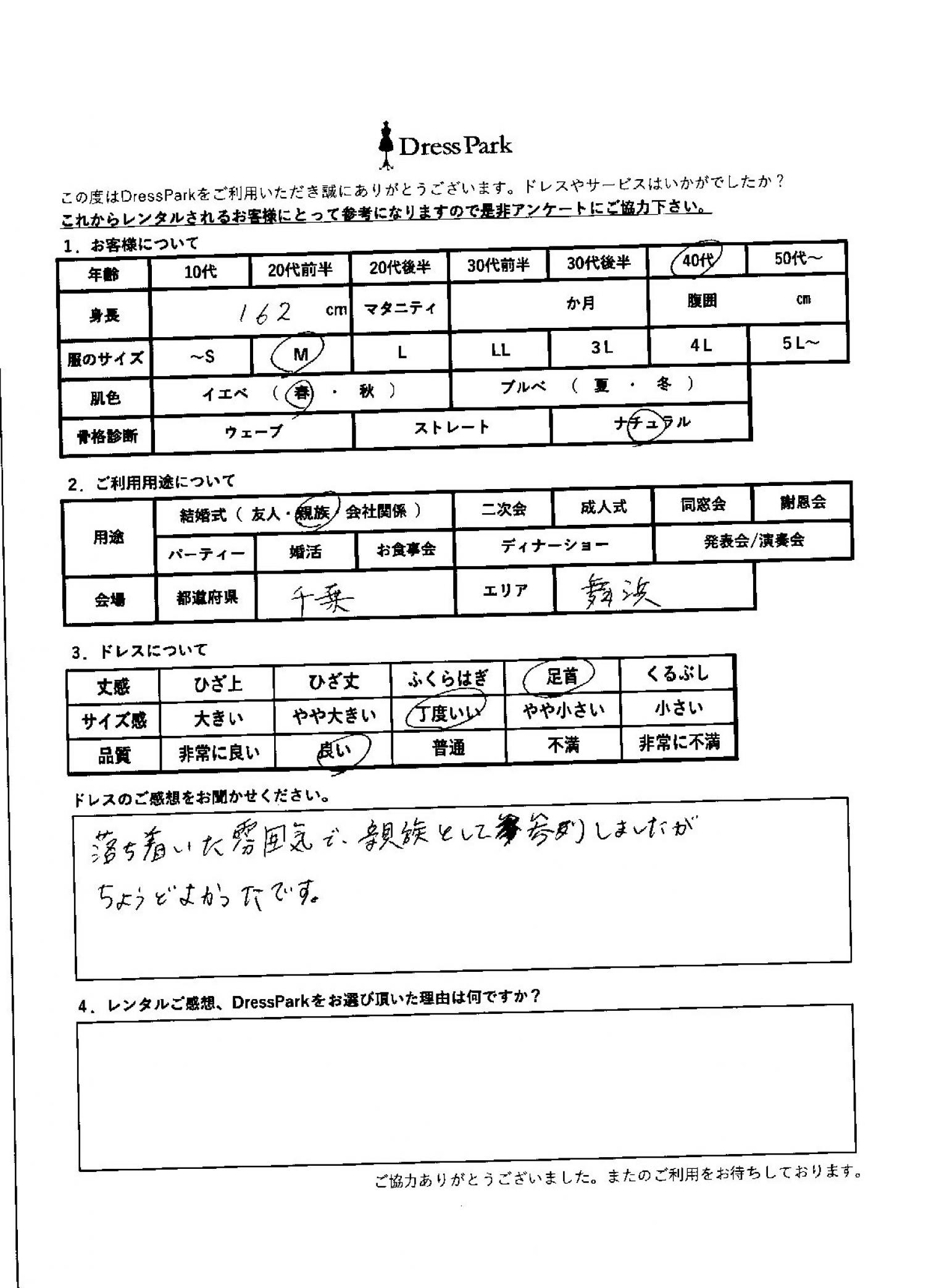 千葉県 N.T様162㎝ Mサイズ舞浜・浦安・幕張 #40代#M/L#160~164㎝#結婚式(親族)#千葉県#舞浜・浦安・幕張 ◆レンタルしたドレスはこちら ◆レンタルしたサイズは:M ◆レンタルした日付:2026/04/25 ドレスの着用感 ◆点数: (4点) ◆丈感:足首 ◆サイズ感:丁度いい ◆品質:良い ◆肌色:イエベ ◆骨格診断:ナチュラル ドレスの感想 落ち着いた雰囲気で親族として参列しましたが、ちょうど良かったです。 CUSTOMER REVIEWS お客様の声 気になるカテゴリー別にご利用の感想をチェック! ◆AGE 年代で見る 10代 20代 30代 40代 50代~ ◆SIZE サイズで見る SS/S M/L 大きいサイズLL~ ◆HIGHT 身長で見る 140~149㎝ 150~154㎝ 155~159㎝ 160~164㎝ 165~169㎝ 170㎝以上 ◆マタニティ ~3か月 4~6か月 7~8か月 9~10か月 ◆肌色 イエベ ブルべ ◆骨格診断 ウェーブ ストレート ナチュラル ◆利用シーン 結婚式(友人) 結婚式(親族) 結婚式(会社関係) 二次会 成人式/同窓会 謝恩会 パーティー その他 CUSTOMER REVIEWS都道府県別お客様の声 都道府県別にのお客様の声をチェック! 北海道 青森県 岩手県 宮城県 秋田県 山形県 福島県 茨城県 栃木県 群馬県 埼玉県 千葉県 東京都 神奈川県 新潟県 富山県 石川県 福井県 山梨県 長野県 岐阜県 静岡県 愛知県 三重県 滋賀県 京都府 大阪府 兵庫県 奈良県 和歌山県 鳥取県 島根県 岡山県 広島県 山口県 徳島県 香川県 愛媛県 高知県 福岡県 佐賀県 長崎県 熊本県 大分県 宮崎県 鹿児島県 沖縄県 CUSTOMER REVIEWSエリア別お客様の声 都道府県別にのお客様の声をチェック! 札幌 仙台 名古屋 軽井沢 金沢 神戸・芦屋 博多 那覇 梅田・新大阪 難波・心斎橋 鎌倉・湘南 横浜・みなとみらい 舞浜・浦安・幕張 大宮・浦和 青山・表参道 六本木・麻布 渋谷・恵比寿 新宿 池袋 銀座・丸の内 お台場・汐留 鹿児島市 郡山市 福島市 東予 甲府・石和 LINEでお問い合わせ このサイトではJavaScriptを使用しています